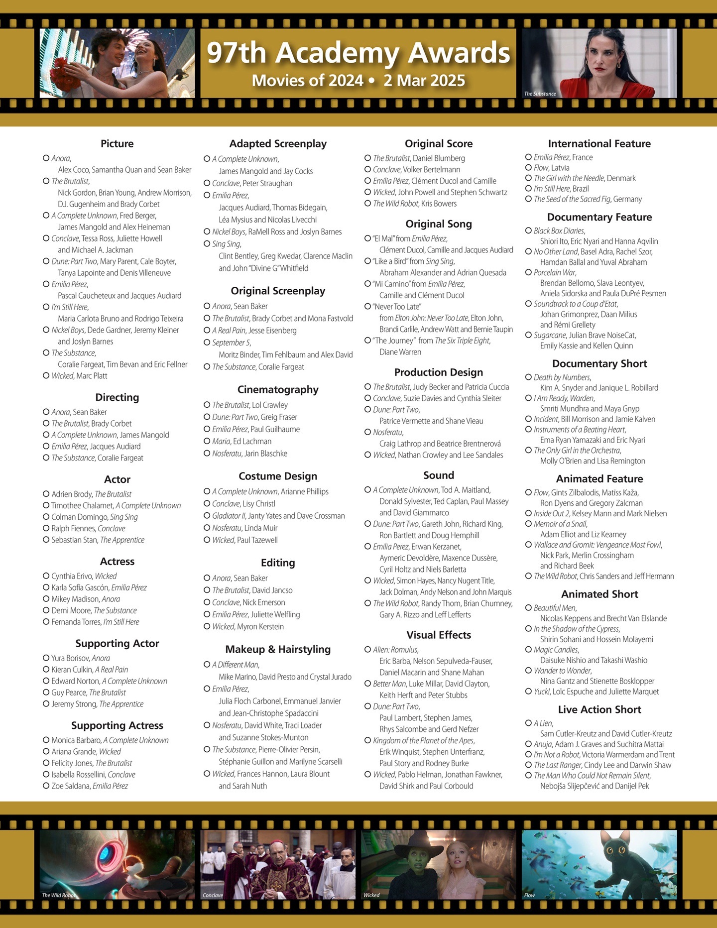 | Best Picture nominees: Anora / The Brutalist / A Complete Unknown / Conclave / Dune: Part Two / Emilia Pérez / I'm Still Here / Nickel Boys / The Substance / Wicked |